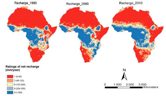 The standard classification of the recharge map is similar for the tree years. Africa has areas with low net recharge rate (<50 mm/year), for which a rating of 1 is assigned, and areas with high recharge ranges (>225 mm/year), particularly in Central Africa and a portion of western Africa, for which a rating of 9 is assigned. We observe an average variation of the recharge between 2000 and 2010. For example, the spatial and temporal variations can be observed near the Lake Victoria and Ethiopia in East Africa and Morocco in North Africa.