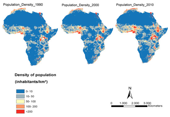 Rating of population density (P) map in Africa for 1990, 2000, and 2010.