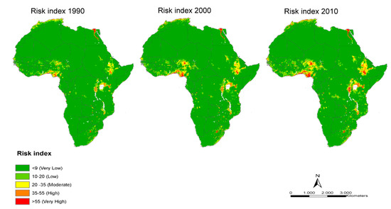 Table 3 shows the percentage of area per class of pollution risk. These results indicate an increasing trend from low to very high pollution risk during the period of 20 years (i.e., 1990 to 2010). The values in this Table 3 confirm that the pollution risk for groundwater in Africa increased to some extent from 1990 to 2010. For example, the percentages of area classified as high pollution risk were 0.55%, 0.87%, and 1.26% for the years 1990, 2000, and 2010, respectively; and the percentages of area classified as very-high pollution risk were 0.29%, 0.48%, and 0.76% for the years 1990, 2000, and 2010, respectively. These data demonstrate that the surface of pollution risk follows an increasing trend.