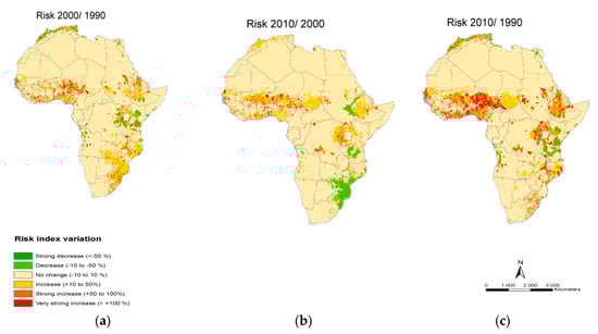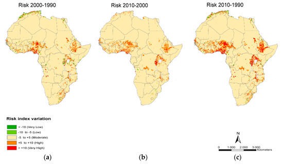 Relative comparison of groundwater pollution risk between (a) 2000 and 1990, (b) 2010 and 2000, and (c) 2010 and 1990 for the African continent.