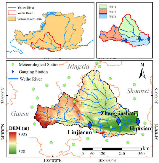 Weihe River (WHR), located in the south of the Loess Plateau, is the largest tributary of the Yellow River. It rises in the Niaoshu hill, flows through 26 counties and cities of Gansu, Ningxia, and Shaanxi provinces, and joins the Yellow River at Tongguan. The Huaxian station is an important hydrological station, which monitors the flow from 106,498 km2 of the catchment (WH), about 81% of the total Weihe River basin. In this study, this region is selected as the study area and divided into three sub-basins by three gauging stations, i.e., WH1 (Zhangjiashan), WH2 (Linjiacun), and WH3 (Huaxian) (Figure 1, Table 1), which covers about 43,216, 30,661, 32,621 km2, respectively. Mean annual runoff is approximately 6.35 ± 3.28 billion m3 with a mean annual precipitation of 536.00 ± 88.02 mm and a mean annual temperature of 9.29 ± 0.62 °C. The Weihe River basin, a key economic development zone and an important agricultural production area, has been subjected to significant human interference and is more sensitive to global warming, due to the coexistence of semiarid and semi-humid climatic conditions and has experienced a significant decrease of runoff in the past 50 years [9,10,11,12].