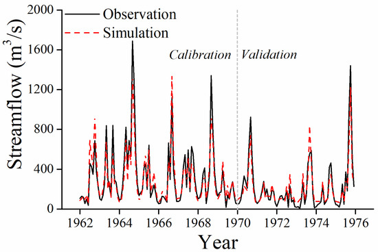 Monthly simulated streamflow against observed streamflow of Huaxian station for the calibration period (1962–1969) and validation period (1970–1976).