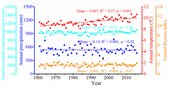 Temporal variations of annual precipitation, temperature, potential evapotranspiration, and the dryness index over the Weihe River basin during 1961–2016.