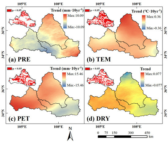The spatial distribution of the multi-year average value and trend were shown in Figure S1 and Figure 4. Precipitation and temperature decreased from southeast to northwest, and the precipitation showed an increasing trend in southeast and north of WH, but a decreasing trend in the southern region, while a significant increasing trend was detected in most of the WH, especially the northern region. Except for the southeast region with a slight downward trend, most of the other regions showed an obvious increasing trend in potential evapotranspiration. The dryness index showed a relatively stable trend and only a small part of the north and southeast was founded to decrease.