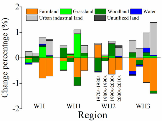 Based on five land use/cover maps for different periods, we found out the mode and intensity of land use/cover change in the WH for each decade in the last 50 years. As shown in Figure 5, the land use/cover change was relatively small before the 1990s, but greater during 1990s–2010s with a decrease of farmland (−0.8% and −0.72%) and an increase in grassland (0.44%) and urban industrial land (0.58%), respectively. Except WH2 during the 1970s–1980s, all the three sub-regions exhibited an obvious decrease of farmland, especially in the last two decades. The woodland of WH2 experienced a process from decrease (−0.53%) to increase (0.49%) during the 1970s–2000s, while a continuous increase of urban industrial land was detected at the cost of reduction in farmland, especially since the 2000s. Besides, the NDVI and LAI were employed to investigate the variability in growth and structure of vegetation (Figure 6). NDVI and LAI of WH were relatively stable with no obvious trend (0.0009 year−1, ; 0.0002 year−1, ) during 1982–2004, while a trend of significant increase (0.0105 year−1, ; 0.0475 year−1, ) was detected since 2005. The WH1 and WH2 exhibited similar dynamic changes in NDVI and LAI with WH, especially for WH2 with a more dramatic increase (0.0149 year−1, ) in NDVI. However, NDVI and LAI of WH3 stayed stable for both value and trend during the whole study period, especially during 1996–2015. This indicated that the obvious improvement of vegetation conditions of WH was mainly caused by WH1 and WH2, which was likely to benefit from the Grain for Green project.