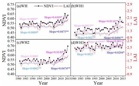 Annual mean satellite-estimated normalized difference vegetation index (NDVI) and leaf area index (LAI) over (a) the Weihe River basin (WH) and the three sub-regions, i.e., (b) WH1, (c) WH2, and (d) WH3, from 1982 to 2015. (* and ** represent and , respectively.)