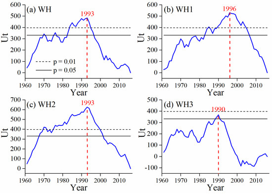 Ut statistic of Pettitt test used for detecting a change-point for annual runoff of (a) the Weihe River basin (WH) and the three sub-regions, i.e., (b) WH1, (c) WH2, and (d) WH3.