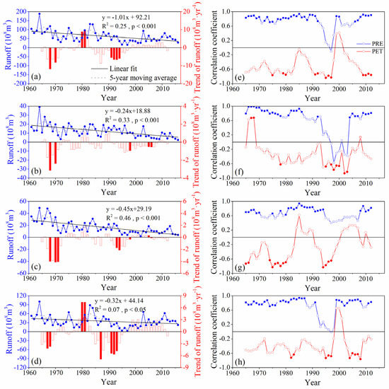 (a–d) Temporal variation of runoff and (e–h) partial correlation coefficient between runoff and precipitation, potential evapotranspiration during 1961–2016 over the WH, WH1, WH2, and WH3, respectively. In a-d, the blue line with dots shows the runoff series, the gray dashed line is the five-year moving average of runoff, the black line and red bar are the trend of runoff over the whole study period and a moving time window of nine years, respectively, where the solid means the runoff trend at the significance level p < 0.05 and the hollow indicates the runoff trend is not significant. The positive values of the runoff trend refer to an increase in runoff during the moving time window, while the negative values refer to a decline. In e-h, the blue line with squares and the red line with circles showed the partial correlation coefficient between runoff and precipitation, potential evapotranspiration, respectively, where the solid indicates a significant correlation and the hollow indicates no significant correlation exists.