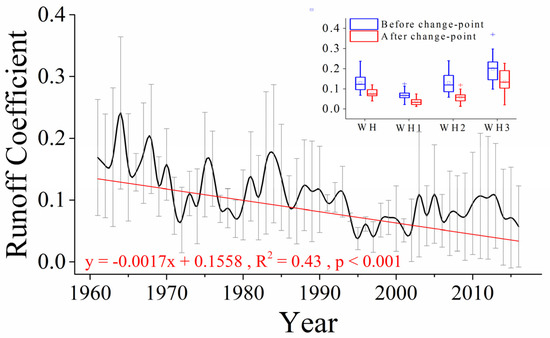 As shown in Figure 9, the mean runoff coefficient of the three sub-regions, ranging from 0.0376 (1995) to 0.2411 (1964), showed a significant downward trend at a rate of −0.0017 year−1 () during 1961–2016. It reached the lowest value in the late 1990s and showed a significant increasing trend (0.0016, ) since 1995. Among the three sub-regions, the runoff coefficient of WH3 with a mean value of 0.1676 is the largest, followed by WH2 (0.0984) and WH1 (0.0549). Compared with rivers of other part of China, the runoff coefficients were relatively lower, especially WH2 and WH1, which was probably because of the low and unevenly distributed precipitation, and a continuously increasing water withdrawal to meet the demand of domestic, industrial, and agricultural water. The runoff coefficient of both WH and the three sub-regions showed an obvious decline after change-point, especially WH2 (−0.072) and WH3 (−0.064).