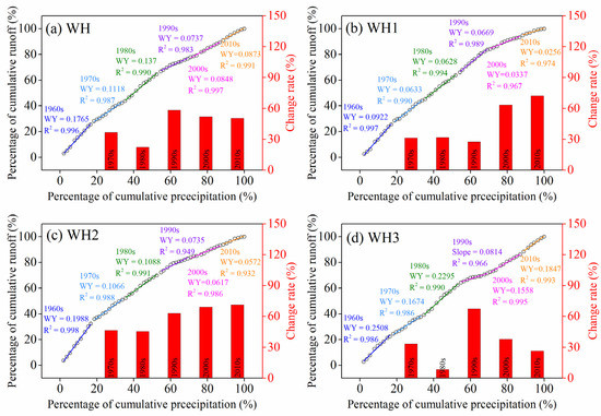 Change of the runoff ratio of (a) the Weihe River basin (WH) and the three sub-regions, i.e. (b) WH1, (c) WH2, and (d) WH3, in each decade during 1961–2016 (with the fitted line shown in different colors); the red bars are the decline ratio of freshwater in runoff of each decade compared with that of the 1960s. Precipitation and runoff are accumulated as percentages of the total values during the study period.