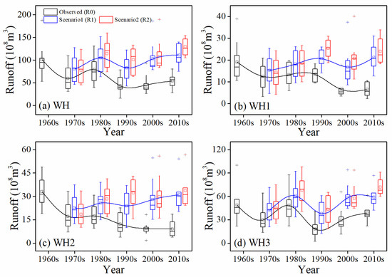 Annual runoff of (a) the Weihe River basin (WH) and the three sub-regions, i.e., (b) WH1, (c) WH2, and (d) WH3, in the three scenarios for each decade since the 1960s.