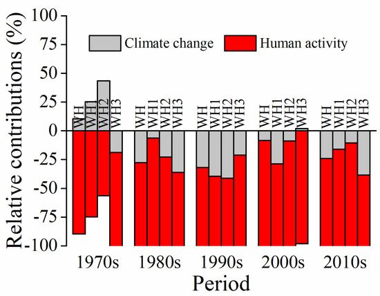 Based on the observed runoff and simulated runoff in two scenarios, the relative contribution of climate change and human activity to runoff variation for each period were quantified (Figure 12). The effect of climate change on runoff was positive to increase runoff in the 1970s, except WH3, while it was going to be negative in the following period, except WH3 with a fairly small increase (0.57 × 108 m3, 1.92%) in the 2000s. To some extent, a positive effect of climate change on runoff can effectively alleviate the decrease of runoff caused by human activity, while a negative effect will exacerbate runoff reduction combined with human water consumption. Human activity was detected to be the dominant factor with the relative contribution well above −50%, ranging from −67.99% (1990s) to −91.56% (2010s), which indicated a greater effect to accounted for runoff decline than climate change in WH. The relative contribution of climate change in the 1990s was the greatest and that of all the three sub-regions exceeded −21%, especially WH2 (−41.15%) and WH1 (−39.60%), which could be an important reason to result in the lowest runoff during the five periods. The climate-induced runoff reduction of WH was comparable in the 1990s and 2010s, but the relative contribution in the 2010s was lower with a drop of 7.9% due to the increased human-induced runoff reduction. Varying intensity of climate change and human activity accounted for the obvious differences in relative contribution to runoff variation of the sub-regions and periods.