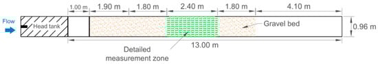 Experiments were conducted in the Ecohydraulics Flume, a 13.0 m long, 0.96 m wide, water-recirculating flume with a gentle slope (S0) of 0.5% located in the Water Resources Engineering Laboratory at Clarkson University. Measurements were taken in a section with a length of 2.40 m located 3.80 m downstream from the flume entrance to ensure that the turbulent flow is hydraulically fully developed. Figure 1 shows a scheme of the flume. Natural semi-spherical shape boulders with an equivalent diameter (D) of 12.50 cm were used as large roughness elements. Experiments were carried out over a gravel bed with d90 = 27.50 mm, d50 = 17.21 mm, and d10 = 9.37 mm, where dp refers to the grain size for which p% of particle sizes are finer. The critical bed shear stress for the median sediment size (d50) was calculated according to [46] formula, and it was 12.38 N/m2, at which incipient sediment motion takes place. As projected, no sediment movement was observed at any set of experiments.