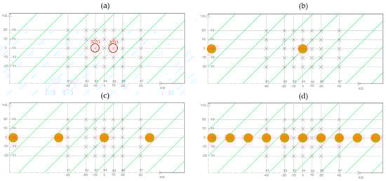 A schematic plan of boulder arrangement in the measurement zone (hatched area) for (a) no boulder, (b) 10D boulder spacing, (c) 5D boulder spacing, and (d) 2D boulder spacing. Cross marks show measurement points for each setup, and large circles show the position of idealized (assumed fully spherical) boulders. Two points X3Y3 and X5Y3 have been marked in (a) as common measurement points in the centerline of boulders in all scenarios.