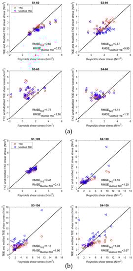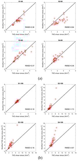 Near-bed shear stress estimated from the turbulent kinetic energy (TKE) method against the modified TKE method for all the measurement points at (a) 60 L/s flow rate, (b) 100 L/s flow rate. The unit of RMSE is N/m2.