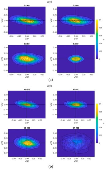 Joint frequency distribution of normalized and at point X3Y3 at (a) 60 L/s flow rate, (b) 100 L/s flow rate.