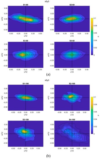 Joint frequency distribution of normalized and at point X5Y3 at (a) 60 L/s flow rate, (b) 100 L/s flow rate.