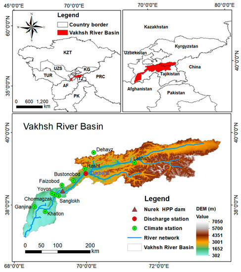 In Central Asia, desiccation of the Aral Sea from the 1960s to the late 1980s and shrinking of glaciers in the mountains of Pamir–Alay and Tian Shan are clear indications of climate change in this region. The Amu Darya River drains into the Aral Sea [5]; the Vakhsh River, which was the focus of this study, is the second largest headwater tributary of the Amu Darya River, originating in the high mountains of Pamir–Alay, and is among the most meltwater-dependent river systems in Central Asia [6]. The total annual flow of the Vakhsh River is 20.22 km3/year, and the area of irrigated land in this river system is about 172.2 thousand hectares [7]. The Vakhsh River is also a major source for the generation of green energy in Central Asia, with the Nurek Reservoir being the largest one in this region (water storage volume of 10.5 km3).