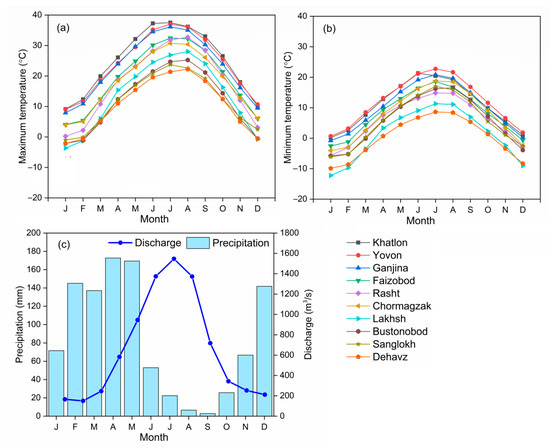 The mean monthly values of (a) the maximum temperature, (b) the minimum temperature, and (c) the streamflow and average monthly precipitation in the Vakhsh River Basin, Central Asia, from 2000 to 2013.