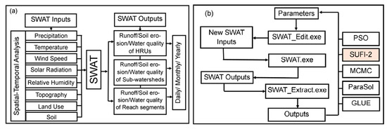 (a) Schematic overview of the Soil and Water Assessment Tool (SWAT) model; (b) the relationship between the Soil and Water Assessment Tool—Calibration and Uncertainty Procedures (SWAT—CUP) and its five optimization algorithms. HRU: hydrological response unit; SUFI-2, Sequential Uncertainty Fitting version 2; PSO: particle swarm optimization; MCMC: Markov chain Monte Carlo; GLUE: generalized likelihood uncertainty estimation.