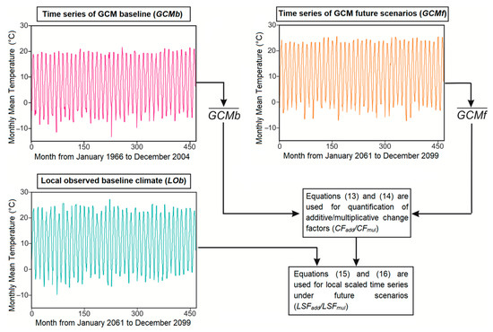 To calculate the additive change factor for the maximum/minimum temperatures and the multiplicative change factor ) for the precipitation, Equations (13) and (14) were used.