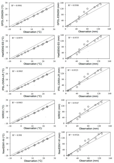With the aim of avoiding the systematic error between GCMs and data observed in situ (such as cumulative monthly precipitation and mean monthly temperature), the correlation of each downscaled GCM with the gauge-based data was assessed separately at the Rasht climate station in the Vakhsh River Basin for the 1966–2004 period.