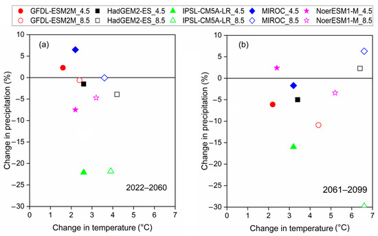 All GCM annual precipitation and temperature changes in the Vakhsh River Basin, Central Asia, under RCPs 4.5 and 8.5 in the (a) 2022–2060 and (b) 2061–2099 periods, relative to the base period (1966–2004).