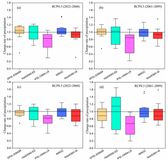 Figure 7 shows the precipitation change rate of all five GCMs during the periods of 2022–2060 and 2061–2099 under RCPs 4.5 and 8.5. The HadGEM2-ES model, represented by the cyan color, had a relatively greater range of average performance than the other GCM models in the study area. The IPSL-CM5A-LR model, indicated with the pink color in Figure 7, showed a lower range than the average performance. The results show that the GFDL-ESM2M, MORIC, and NoerESM1-M models performed consistently under both RCPs during the two future time periods.