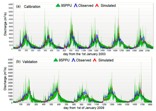 (a) Daily calibration (2003–2008) and (b) validation (2009–2013) using elevation band (EB) method in the application of the SWAT—CUP tool to the Darband discharge station in the Vakhsh River Basin in Central Asia. The observed discharge data (blue lines) are presented along with the prediction uncertainty (green range) and a set of 1000 simulations (red lines). 95PPU: 95% prediction uncertainty.