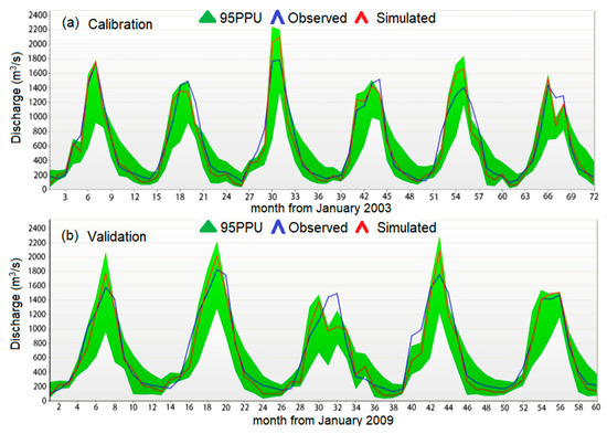 (a) Monthly calibration (2003–2008) and (b) validation (2009–2013) with the elevation band (EB) method in the application of the SWAT–CUP tool at the Darband discharge station in the Vakhsh River Basin in Central Asia. The observed discharge data (blue lines) are presented along with the prediction uncertainty (green range) and a set of 1000 simulations (red lines). 95PPU: 95% prediction uncertainty.