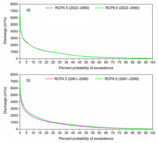 Flow duration curves of the study area at the Darband station based on the multi-model ensemble (MME) during (a) the 2022–2060 under RCP4.5 and RCP8.5 and (b) 2061–2099 periods under RCP4.5 and RCP8.5 in the Vakhsh River Basin, Central Asia.