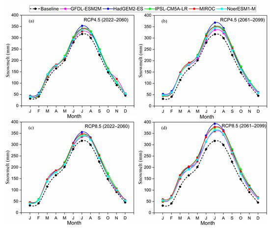 The projected monthly snowmelt during the 2022–2060 and 2061–2099 periods for the five GCMs under (a,b) RCP4.5 and (c,d) RCP8.5 in the Vakhsh River Basin, Central Asia.