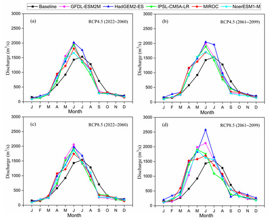 In the two future time periods, by considering the average monthly discharge, the peak flow was estimated in the Vakhsh River under the RCP4.5 and RCP8.5 scenarios (Figure 12). The mean monthly discharge in the first time period showed an increasing trend in the months of April to June and a slight decreasing tendency in the months of August to May for all five GCMs under RCP4.5 and RCP8.5. Under both RCPs, in the 2061–2099 future time period, the mean monthly discharge increased for all five GCMs in the months February to July. The mean monthly discharge mostly showed a decreasing trend in the months of August to January under both RCPs in the second future time period. Under RCP4.5 in the first future time period, the mean monthly peak discharge was 1978 m3/s in June for GFDL-ESM2M, 2020 m3/s in June for HadGEM2-ES, 1942 m3/s in June for IPSL-CM5A-LR, 1814 m3/s in June for MIROC, and 1665 m3/s in June for NoerESM1-M under RCP8.5 for the same future time period; corresponding values of 2059 m3/s in June for GFDL-ESM2M, 1973 m3/s in June for HadGEM2-ES, 1900 m3/s in June for IPSL-CM5A-LR, 1743 m3/s in June for MIROC, and 1857 m3/s in June for NoerESM1-M were obtained compared to the baseline mean monthly peak discharge of 1534 m3/s in the month of July. In the 2061–2099 future time period under RCP4.5, the mean monthly peak discharge was 1996 m3/s in June for GFDL-ESM2M, 2049 m3/s in June for HadGEM2-ES, 1898 m3/s in June for IPSL-CM5A-LR, 1701 m3/s in June for MIROC, and 1706 m3/s in June for NoerESM1-M. Accordingly, in the 2061–2099 future time period under RCP8.5, the mean monthly peak discharge was 2123 m3/s in June for GFDL-ESM2M, 2577 m3/s in June for HadGEM2-ES, 1903 m3/s in May for IPSL-CM5A-LR, and 1701 m3/s in June for MIROC, and 1873 m3/s in May for NoerESM1-M compared to the baseline mean monthly peak discharge of 1534 m3/s in the month of July.