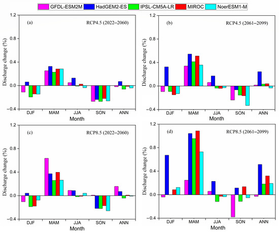 Table 5 shows the comparative variations in mean seasonal and annual flows in the future 2022–2060 and 2061–2099 time periods, relative to the baseline condition of the seasonal and annual average flows. The measured mean values of the river flow at the Darband gauging station in the Vakhsh River Basin were 170 m3/s in winter, 588 m3/s in spring, 1415 m3/s in summer, 425 m3/s in fall, and l649 m3/s annually during the 2000–2013 period. Analysis of simulated river flows revealed that under the RCP4.5 and RCP8.5 scenarios, the alterations in the winter flows mostly increased. The changes in the winter flow could vary from −23.1% to 29.7% and from −21.1% to −63.9% in all projected time periods under these RCPs. It is expected that the spring flow could increase by 25% to 61.4% under RCP4.5 and by 27.3% to 119.6% under RCP8.5 in the entire projected period (2022–2060 and 2061–2099). Variations in the summer river flow compared to the baseline condition are expected to vary from −4.9% to 15.5% under RCP4.5 and from −12% to 22% under RCP8.5. In the entire projection period (2022–2060 and 2061–2099), the fall seasonal flows are expected to decrease by 4.3% to 32.9% under RCP4.5 and could vary from −37.7% to 15.9% under RCP8.5. In all of the projected time periods, the mean annual river flows could range from −21.1% to 25.6% under RCP4.5 and from −3.3% to 52.3% under RCP8.5. In the second time period (2061–2099), the annual average flow was mostly predicted to increase under RCP4.5. In the 2061–2099 period, four GCMs (GFDL-ESM2M, HadGEM2-ES, IPSL-CM5A-LR, and MIROC) showed that annual average flow might increase by 2.3% to 25.6% under RCP4.5, while the other GCM (NoerESM1-M) showed that the annual average flow might decrease by 2.7%. Under RCP8.5, three GCMs (GFDL-ESM2M, IPSL-CM5A, and NoerESM1-M) showed that annual average flow could vary from 0.3% to 3.3%, while two GCMs (HadGEM2-ES and MIROC) showed a possible increase in the annual flow from 2.3% to 7.8% in the 2022–2060 time period. In the first future time period (2022–2060), under RCP4.5, four of the five GCMs (GFDL-ESM2M, IPSL-CM5A-LR, MIROC, and NoerESM1-M) showed a decrease in annual average flow in the Vakhsh River of 1.4%–6.4%, while the other GCM (HadGEM2-ES) under RCP4.5 showed that the annual average flow might increase by 7.4%. Under RCP8.5 in the 2061–2099 time period, the variation in the average annual flow indicated an increasing tendency and could vary from 17.5% to 52.3%. In the second future time period (2061–2099), an increasing trend of the average annual flow for all GCMs was indicated under RCP8.5.