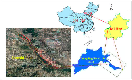 The Yongding River is one of the four major flood control rivers in China. It is the largest river in the Haihe River system, occupying a total area of 47,000 km2 (Figure 1). The river basin in Beijing covers an area of approximately 3200 km2, and the Beijing section of the river is 170 km long. This river has been mainly used as a flood channel in Beijing, and the ecological conservation and urban landscape of the river have been neglected to some extent []. Consequently, the ecological environment along this river and its banks has been deteriorating, detrimentally affecting its image as the “mother river” of Beijing []. The Yongding River is an ecological link to the southwest region and an important ecological corridor in Beijing. Therefore, urgent measures are required to enhance the management of the river and improve the quality of the urban ecological environment, with a view to accelerate the transformation of the city of Beijing as an international, liveable city.