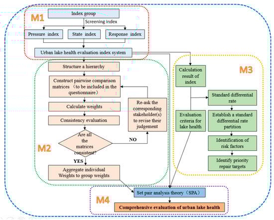 There are four functional modules in the entire urban lake evaluation framework (Figure 2): the health evaluation index screening module (M1); the evaluation index weight determination module (M2); the risk factor identification module (M3); and the health comprehensive evaluation module (M4).