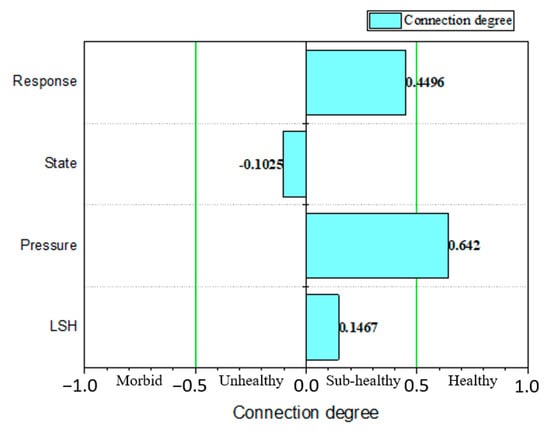 As shown in Figure 3, the connection degree of Lianshi Lake was 0.1467 (i.e., between 0 and 0.5), and the status of the health of the lake was sub-healthy. While evaluating the overall health status of Lianshi Lake, three sub-modules (pressure, state, and response) of the M1 module (Figure 2) were evaluated []. The results obtained showed that the pressure sub-module was in a healthy state, the state sub-module is in an unhealthy state, and the response sub-module is in a sub-healthy state.