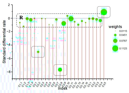 Figure 4 shows the SDR (vertical coordinate) of each indicator, and the bubble size represents the global weight of the corresponding indicator. The figure clearly shows that the distance between the landscape connectivity (C2.2) and lake residence period (C2.8) is relatively large, with the values of the standard difference rate being −5 and −7.65, respectively. The regional population quality (C3.5) is shown to have exceeded the health standard, and it has a large weight in the entire system, with the value of the standard difference rate being 0.933. The area surrounded by the dotted line is a more accurate indicator of health, and the values of the standard difference rate are between −1.2 and 0.5. However, SDR alone cannot detect the influencing risk factor, because the weight of each indicator is different.