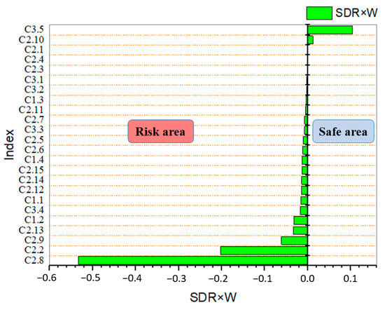 The risk areas were divided according to the value of SDR×W. Figure 5 shows that two indices, heavy metal pollution in the sediment (C2.10) and regional population quality (C3.5), are in the safe area, while the other indices are in the risk area.
