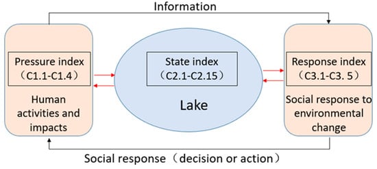 To comprehensively evaluate the health level of urban lakes from both natural and social perspectives, it is necessary to develop evaluation models and methods that conform to both social needs and ecosystem integrity []. Such models and methods can be used to evaluate the health of urban lakes and, as the risk factors affecting lake health are identified locally, a basis can be constructed for the establishment of urban lake development and management strategies.