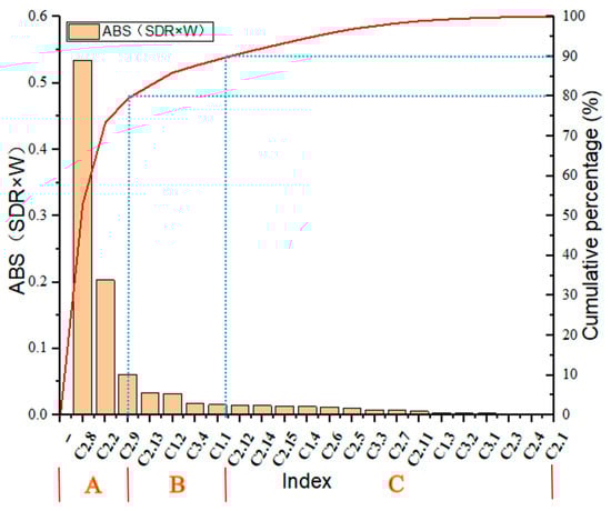 First, in the risk indicators, the ABS (SDR×W) numerical value was sorted, and the percentage of the risk degree of each indicator in the total risk degree was calculated, after which the percentage cumulative curve was drawn. Subsequently, level grouping was carried out on the curve: Category A, with a cumulative frequency of 0–80%, is a major risk index; Category B, with cumulative frequency of 80–90%, is a secondary risk index; and Category C, with cumulative frequency of 90–100%, is a micro risk index.