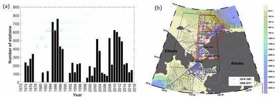 The ocean temperature and salinity data of the region 175° E–155° W, 60°–75° N are obtained from the World Ocean Database (WOD13) at the National Oceanographic Data Centre (https://www.nodc.noaa.gov), which contains the high-resolution conductivity-temperature-depth (CTD) data from 1974 to 2017. The dataset provides the temperature and salinity data with a high level of quality control, including all preliminary and automatic quality control checks (i.e., minimum/maximum range assessment) [27]. An additional data source is the Chinese National Arctic Research Expedition (CNARE), which includes the observations from cruises conducted in 1999, 2003, 2008, 2010, and 2014 (http://www.chinare.org.cn). The hydrographic measurements from CNARE were collected using MarkIIIC and Sea-Bird SBE 9 CTD. After the removal of profiles that were positioned over land, wrong or empty stations, 10,518 profiles remain for the summer months (July, August, and September). The observation data do not cover all years. The time series of the number of stations counted by each year is shown in Figure 1a, and the distribution of all profiles in the study domain is shown in Figure 1b; the purple dots represent the stations from 1974 to 1997, and the yellow dots represent the stations from 1998 to 2017. In this paper, we used potential temperature and salinity to study water mass characteristics and hydrographic features.
