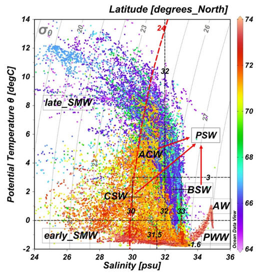 The T-S diagram for all available hydrographic data in the study domain are shown in Figure 2, colored by the latitudes of the observations. The two mixed water masses, BSW and CSW, occupy the lower and higher latitudes, respectively. The SMW has a large range of temperatures depending on the season. Following previous study [28], we distinguish between newly melted water (early_SMW; with temperatures approaching the freezing point) and old melted water (late_SMW, with temperatures far above the freezing point). The PSW is comprised of ACW, BSW and CSW.