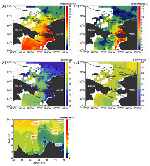 Figure 3a–d shows the maps of shelf-wide distributions of the long-term (1974–2017) summer mean surface temperature and salinity. During summer, warmer (T > 3 °C) and saltier (S > 30) surface PSW occupies approximately the entire Chukchi shelf, and colder (T < 3 °C) and fresher (S < 30) melting water exists in the north of the shelf edge (100 m isobaths). There are two relatively cold areas over the Chukchi shelf; one extends along the east Siberian coast because of the cold East Siberian Current that flows southward, and the other extends over the Herald Shoal, which results from a Taylor column that traps ice and cold water above the shoal and therefore results in ice melting that is later than that in the surrounding water [29]. The warmest ACW flows through the eastern channel of the Bering Strait and continues to flow along the Alaskan coast. The ACW has two branches owing to the bifurcation of the coastal current [10,30,31]. One flows north-eastward along the Alaskan coast to the Barrow Canyon; the other extends offshore from the Alaskan coast near Point Hope toward the northwest, which clearly manifests as a northwest-extending warm tongue; subsequently, the warm water flows eastward along the northern part of the Herald Shoal. The distribution of the surface water properties clearly reflects the surface circulation pattern (see Figure 1 in Corlett and Pickart [32]). The bottom water is less influenced by the local air-sea fluxes; thus, it usually keeps its original water properties. The north edge of the PSW is located approximately 72° N, approximately along 50 m isobaths; north of the PSW is the PWW, which occupies the northeastern Chukchi shelf and slope (Figure 3b).