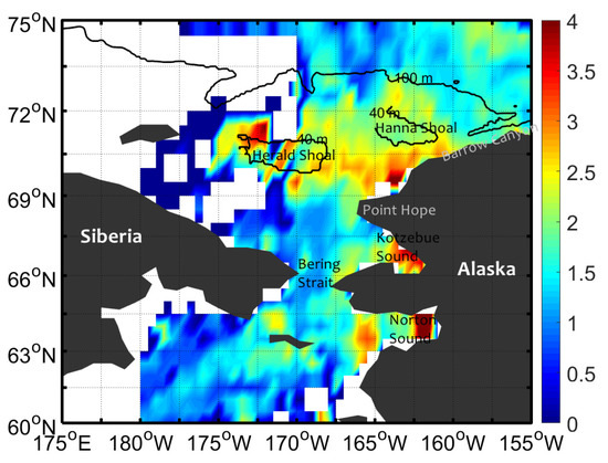- Overland, J.E.; Roach, A.T. Northward flow in the Bering and Chukchi seas. J. Geophys. Res. Space Phys. 1987, 92, 7097. [Google Scholar] [CrossRef]