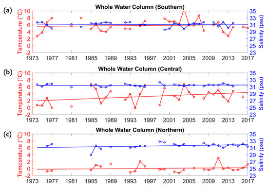 To further our understanding of the long-term hydrography changes, the similar calculation has been done for the surface and bottom layers, the results are listed in Table 1. The central shelf has the most significant changes in both temperature and salinity. The linear trends of surface temperature and surface salinity in the central shelf are +0.67 °C/decade and +0.23 psu/decade, respectively. While the trends in the bottom temperature are less evident than those of the surface layer, the bottom salinity in the central shelf has a negative trend of −0.16 psu/decade. The opposite trends in surface and bottom layer salinity leads to a statistically not-significant trend for the whole water column in the central shelf as mentioned above. The opposite trends also imply that the vertical structure of the salinity has changed. In the southern and northern shelf, surface warming and salinification are not significant. Bottom salinity of the southern shelf decreases with a significant negative trend of −0.20 psu/decade, probably because of the enhanced transport of the fresher Pacific inflow.