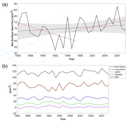 (a) Time series of net surface heat flux (NSHF) in the Chukchi Sea during summer from 1983 to 2009. The dash lines are trends of the whole (black line), pre- and post-1997 (red lines) periods. The gray shading indicates the two-sided 95% confidence boundary. (b) Time series of NHF (red line), net short-wave radiation (black line), net long-wave radiation (blue line), latent heat flux (green line) and sensible heat flux (magenta line).
