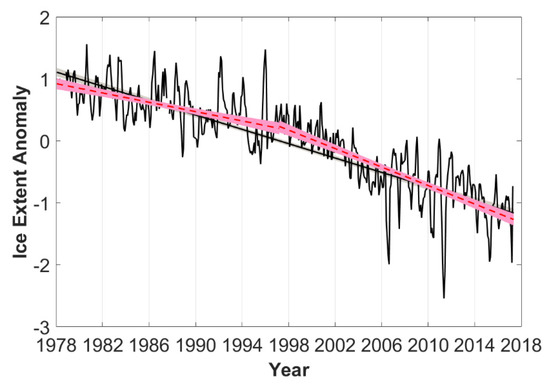 Time series of monthly sea-ice extent anomaly in the Arctic from 1979 to 2017. The gray and red shadings indicate the two-sided 95% confidence boundary.