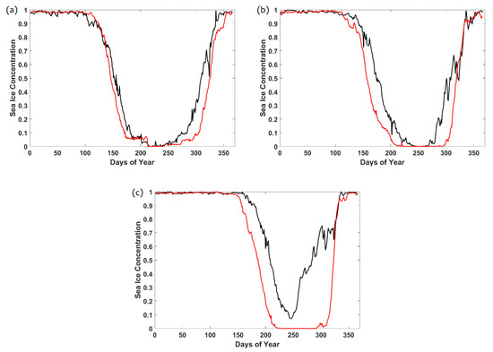 Daily evolutions of the area-averaged ice cover in (a) southern, (b) central and (c) northern Chukchi Sea; black curves represent multi-year mean data from the pre-1997 period, while red contours represent the post-1997 period.