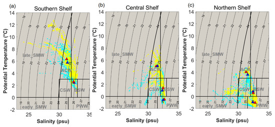 T–S diagrams of (a) southern, (b) central and (c) northern shelf. The light blue and yellow dots belong to the pre- and post-1997 periods, respectively; blue and red solid triangles denote the mean values of the water masses of the pre- and post-1997 periods, respectively.